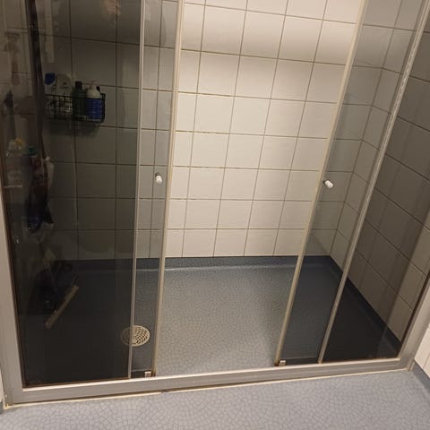Duschhörna med skjutbara dörrar och vit ram. Hörnmodell som monteras mot vägg.