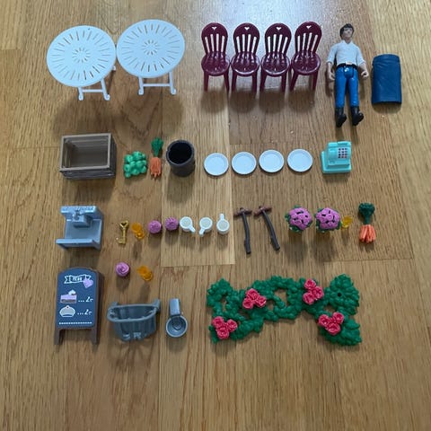 Schleich café med bakelser, bord, stolar, häst och tillbehör till både café och häst.
