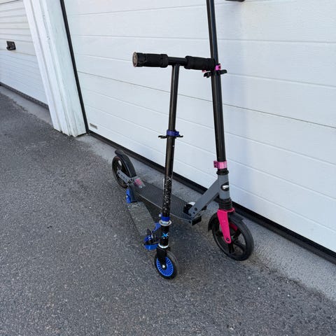 Sparkcykel i aluminium med svarta handtag och fotplatta. Den är hopfällbar för enkel förvaring och transport. Hjulen är svarta som använts fåtal gånger. Nypris:679kr.