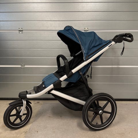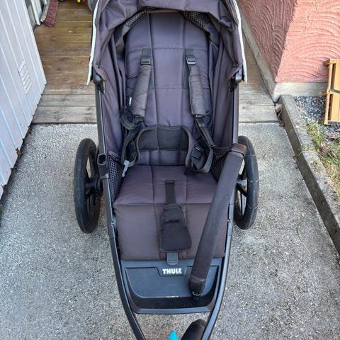 Thule springvagn i svart färg. Vagnen har tre stora hjul, varav framhjulet är svängbart, vilket gör den lämplig för löpning och promenader på varierat underlag. Den har justerbart handtag, sufflett och sittdel med sele för barnet. Fotstödet är integrerat och chassit är utformat för stabilitet och god manövrerbarhet. Passar för vardagsbruk och träning utomhus.