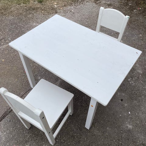 IKEA barnmöbelset bestående av ett rektangulärt bord och två stolar i vit färg.