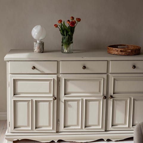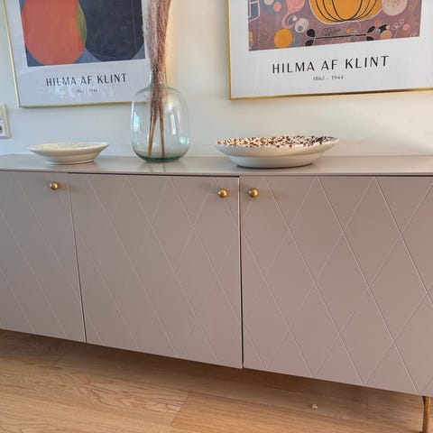 Snygg elegant skänk som rymmer väldigt mycket. 4 skåpsluckor, 1 hyllplan i varje del. Skåpet består av 1 stor del. Grå med silver handtag vilket kan bytas ut mot önskad färg. Benen är grå. Fint komplement till köksskåp tex då den har rymt väldigt mycket porslin och annan pryl. Djur och rökfri hem. I mycket fint skick förutom