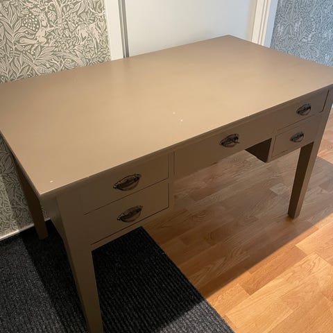 För den händige kan slipning och färg väcka liv i detta skrivbord. Låsen är fungerande på höger sida. I mitten och på vänster sida behöver slutbleck monteras eller karvas ut för att låsen ska uppnå tänkt funktion.