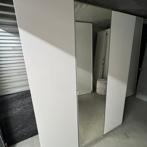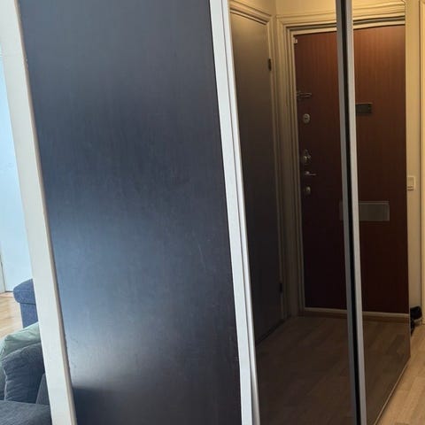 Säljer en rymlig garderob med skjutdörrar, varav ena dörren är spegel. Perfekt för förvaring av kläder och ger samtidigt en bra helkroppsspegel.