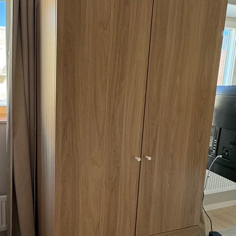 Enkla och lättplacerade garderober med en klädstång och ett övre hyllplan i vardera garderob.