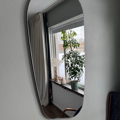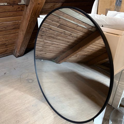 Rund spegel med kant i mässing, i mycket fint skick. 65 cm i diameter. Smidig upphängning. Finns på Liljeholmen i Jönköping