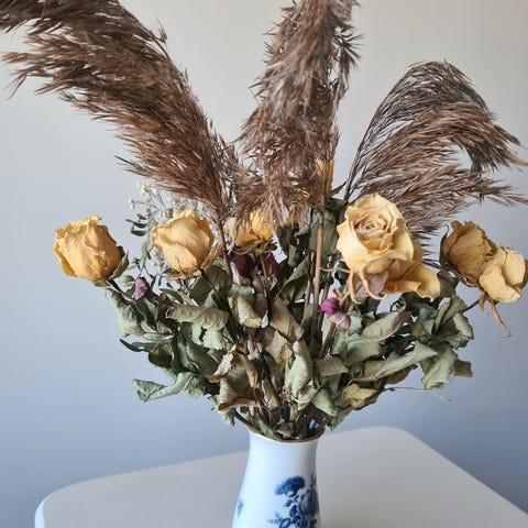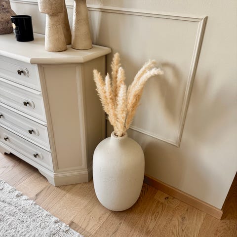 Dekorationsväxter i form av torkat pampasgräs och andra torkade strån och blommor i beigea och naturfärgade toner. Passar som inredningsdetalj i vas på bord, fönsterbräda eller hylla. Ger ett naturligt uttryck och kräver ingen skötsel.