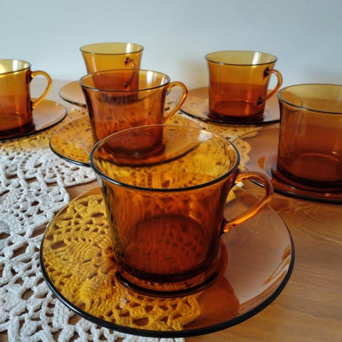 Duralex kaffekoppar i bärnstensfärgat glas – 9 koppar med fat