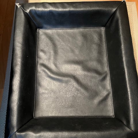 Rektangulär 70cm x 60cm hundbädd i svart färg. Bädden har upphöjda kanter runtom och en plan liggyta i mitten. Yttermaterialet konstläder. Som ny.