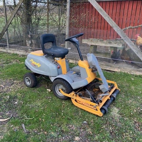 Klippaggregatet är placerat framtill för god överblick vid klippning. Maskinen lämpar sig för klippning av större gräsytor, exempelvis villatomter eller grönytor. På bilden syns även en vagn som ingår.