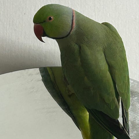 Kanske kan fungera med en annan fågel, men kan inte garantera något. Skulle gärna se att du redan har en annan halsbandsparakit innan så möjligt finns till sällskap. Måste iallafall ha egen erfarenhet av halsbandsparakit innan, kunskap om rätt foder (inte ge bara frön) och han ska ha möjlighet att få flyga fritt ett par timmar/dag.
