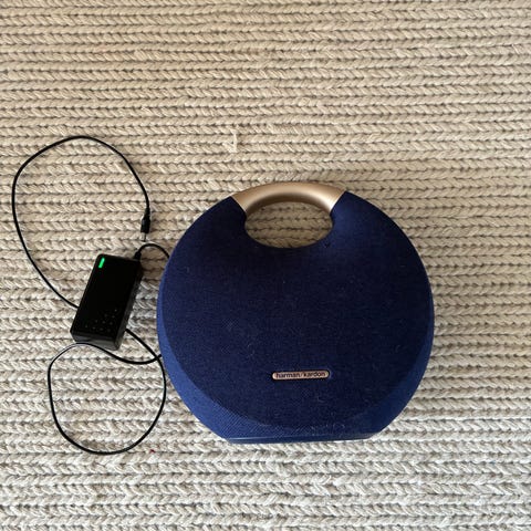 En bärbar Bluetooth-högtalare i modellen Harman Kardon Onyx Studio 5. Högtalaren fungerar felfritt, men är lite solblekt och kantstött på baksidan. Laddare medföljer.