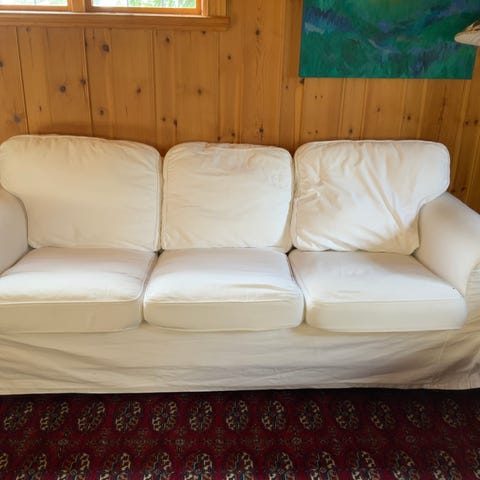 Två Ektorpsoffor. De har stått i en sommarstuga och är sparsamt använda (inte nedsuttna). Nytvättade och fräscha. Inga husdjur och ingen rökning, dock en vinfläck på baksidan av en kudde. Bilderna är tagna i olika ljus, men det är samma färg på båda.