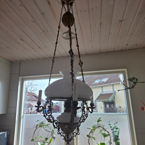 En vintage taklampa i glas och mässing, troligen tillverkad under 1900-talets andra hälft. Denna typ av belysning beskrivs ofta som en "visserslamp" eller "fiskarlampa" i skandinavisk design, inspirerad av klassiska skeppslyktor med en elegant kombination av material.