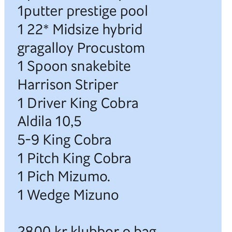 Golfklubbor bestående av ett järnset med flera klubbor samt en putter. Järnklubborna har metallhuvuden och raka skaft med grepp i svart material. Setet kan användas för spel på golfbana och träning på range. Exakta loft, flex och varumärke framgår inte av bilderna.