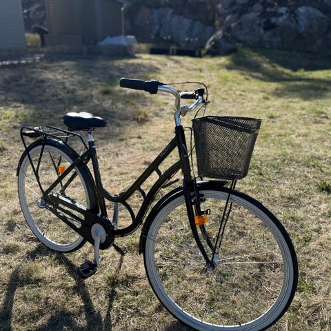Bekväm och stabil, perfekt för pendling och vardag. Utrustad med fotbroms, handbroms, pakethållare, stänkskärmar samt en praktisk korg framtill.