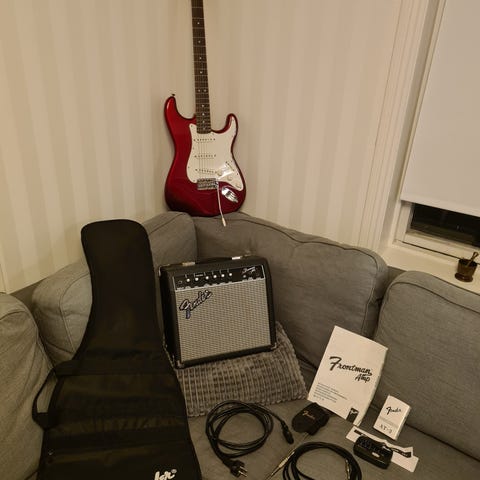 Gitarren visas tillsammans med en Squier‑märkt förstärkare, axelband och instrumentkabel, vilket gör den lämplig för elgitarrspel hemma, övning och enklare inspelning eller replokalsbruk.