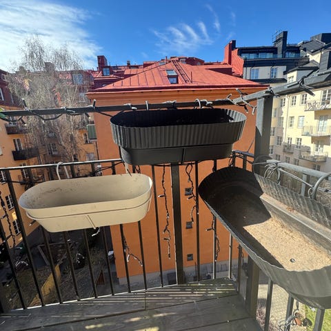 Hängande krukor i flätad korg i grå ton. Krukorna är försedda med kedjor och krokar för upphängning, exempelvis på balkong eller altan. Passar för plantering av blommor eller andra växter. Säljes som par enligt bilder.