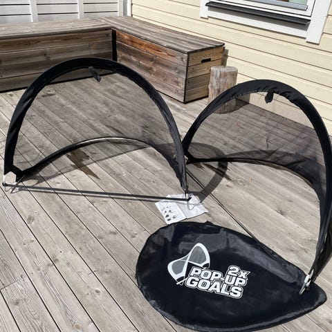 Stabila målburar som är utmärkta till både lek och träning. Helsvetsade i stål med nät. Tål hård behandling. Mått: bredd nere 80 cm (75); höjd 55 cm (52), djup 30 cm. Pris 750 för båda eller bud.