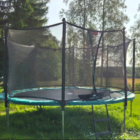Studsmattan är kasserad med 30+ hål i mattan och rostig ram men skyddet är helt så det säljes.