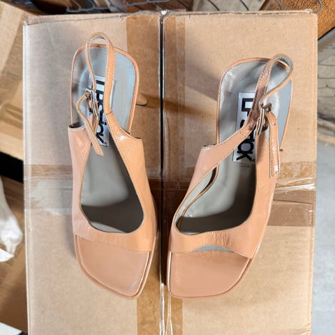 Säljer ett par helt oanvända sandaletter i ljusbrunt/beige läder. Klassisk och stilren modell med bred klack som ger bra stabilitet och komfort.