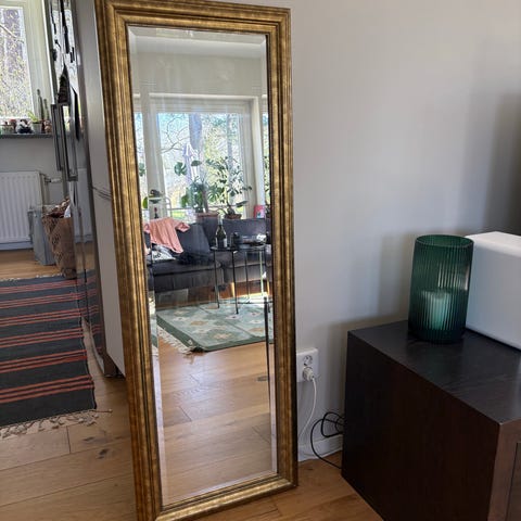 Rusta spegel ”STAFFAN” med guldfärgad ram. Baksida med upphängningsfästen för montering på vägg.