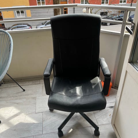 Skrivbordsstol i konstläder. Har en liten reva på armstödet (se bild), i övrigt fint skick. Hämtas i Sundbyberg