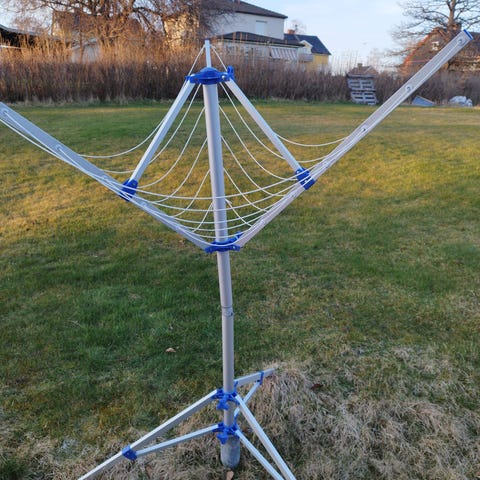 Fristående torkvinda i metall med flera armar och torklinor för utomhusbruk för torkning av tvätt i trädgård eller på tomt. Hopfällbar konstruktion för enklare förvaring när den inte används. Höjd ca 170 cm, bredd ca 170 cm uppfälld.