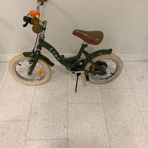 Bild 3-4: 16” svart Stoy barncykel som är pumpad, smord och klar för nya äventyr. Tyvärr förekommer rost, kanske går att polera bort på något sätt? Pris efter skick. Utrustad med fotstöd.
