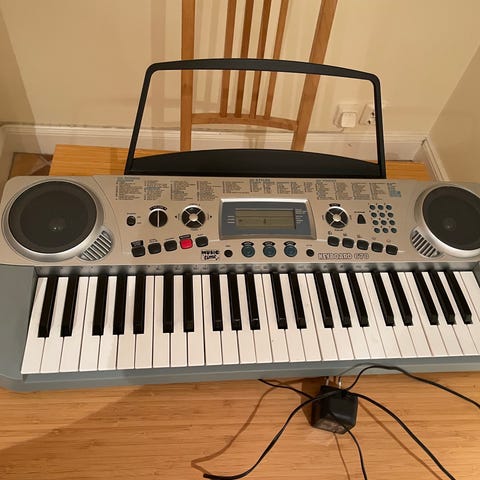 Keyboard med ställ, sittpall, microfon och hörlurar. Fungerar felfritt men har tyvärr en fallskada i ena hörnet (se bild) detta påverkar dock inte funktionen. Säljes därför billigt pga skadan. 350kr för hela paketet. Hämtas i Sollentuna.