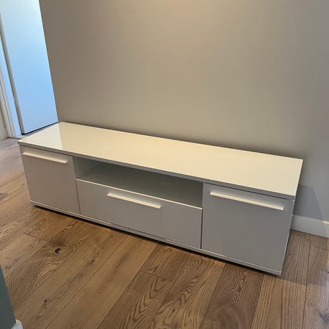 Tv bänk från IKEA. Den har två stora lådor och 3 hyllor. Mycket bra förvaringsmöjligheter i den.