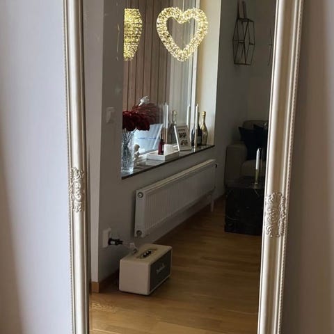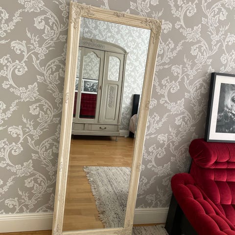 Ramen har profilerade och ornamenterade detaljer som ger ett klassiskt uttryck. Passar i exempelvis hall, sovrum eller vardagsrum för helkroppsspegling och rumsförstoring.