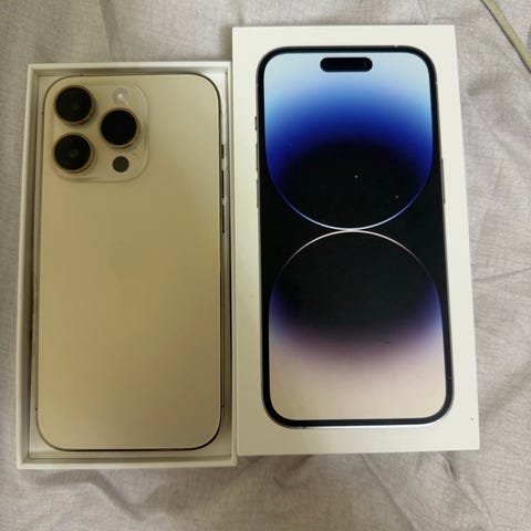 Apple iPhone 14 Pro Max mobiltelefon med 256 GB intern lagring. Modellen har stor skärm, tre bakre kameror och frontkamera i skärmens övre del. Färg: vit baksida med metallram. Levereras med originalkartong och laddkabel enligt bild. Lämplig för appar, media, surf och vardaglig användning med gott om lagringsutrymme för foton, video och filer.