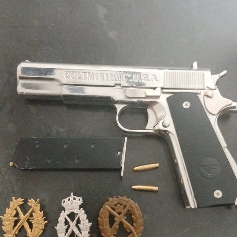 Denix Colt Navy 1851 replika revolver. Vacker Colt, utsirad och ska vara en replika från en Offcer i Amerikanska inbördeskriget. Vacker revolver. Dock, tyvärr, så är inte alltrid Denix repliker så välgjorda. Så denna är skramlig och en skruv saknas på vänster sida, se bild. Perfekt för samling, vitrin eller hängas på väggen, dock inte användas. Säljer därför billigt. OBS! Hölster medföljer INTE!!!