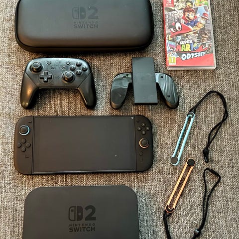 En svart Pro Controller handkontroll . Förvaring ingår i form av ett hårt fodral med plats för konsol, handkontroller och spelkassetter.