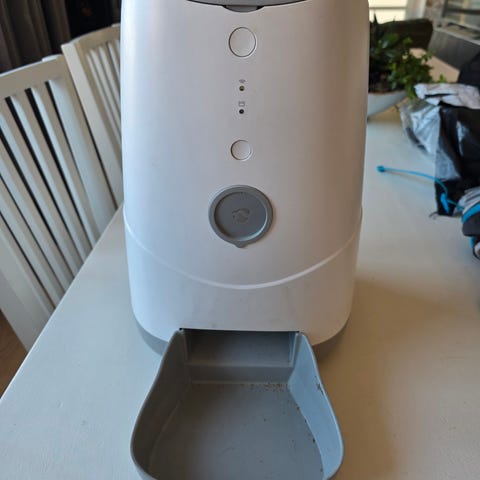Magnusson fodertunna för förvaring av hundfoder. Tunnan är tillverkad i plast och har hjul baktill för enkel förflyttning. Utsidan är vit med röd panel och motiv av hundar. Locket är grått med vit kant och har en separat öppning upptill. Till tunnan hör en grön plastskopa som kan användas för uppmätning och hantering av fodret. Passar för torrfoder och annan djurmat som behöver förvaras torrt och skyddat.