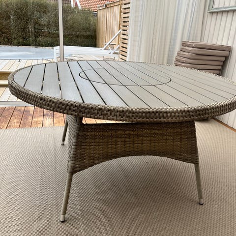 Runt utebord i underhållsfritt kompositmaterial med trästruktur och metallstativ