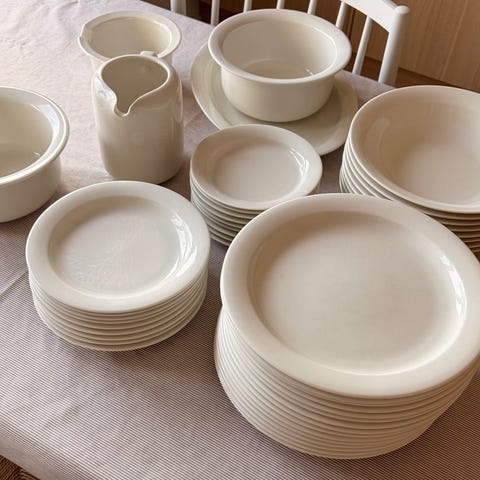 Arabia porslinstallrikar i vit färg med blå kant. Servisen består av 7 st tallrikar 26cm, 8 st assietter 20cm samt 6 st djupa tallrikar Passar som vardagsservis eller till servering av förrätt, varmrätt och efterrätt. Klassisk rund form i glaserat porslin.