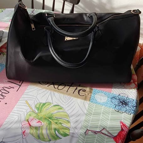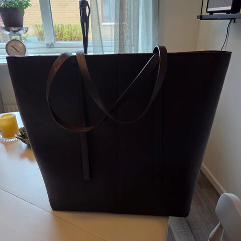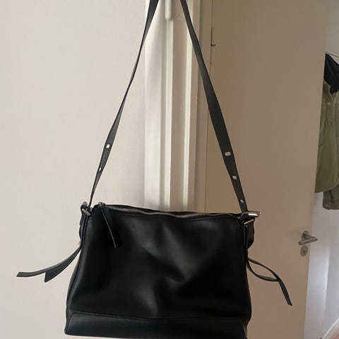 Svart Gina Tricot handväska. Väskan har två längre handtag för bärning i handen eller över axeln.