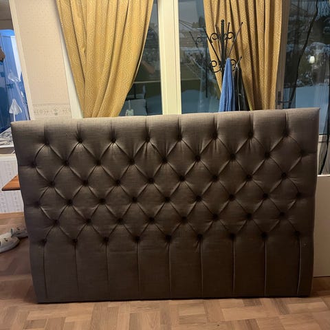 Egengjord sänggavel i rustik stil, byggd i massivt trä och betsad mörkbrun för ett varmt och ombonat uttryck.