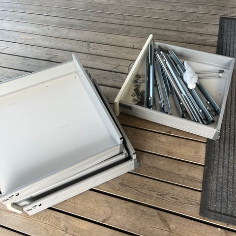 11 st lådor med måtten 55x49 cm och 2 lådor med måtten 45x49 cm inklusive skenor. Pris 200:- per låda