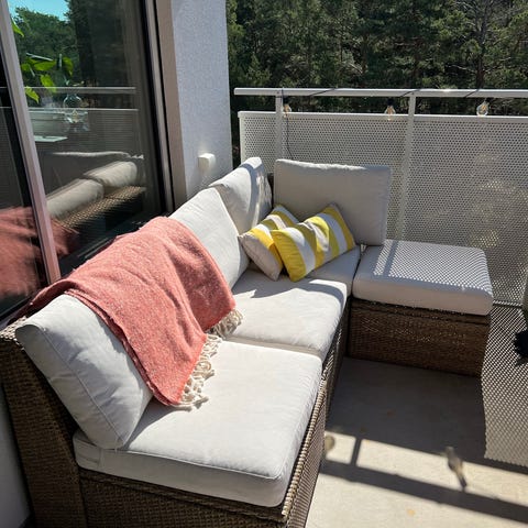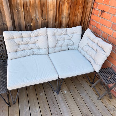 Dynor egentligen tänkt för en lastpall-soffa, men använd till en vanlig utemöbels-modul. Sparsamt använda och har spenderat större tiden i förråd. En av dynorna har en reva som syns på bilden. Ordentlig komfort!