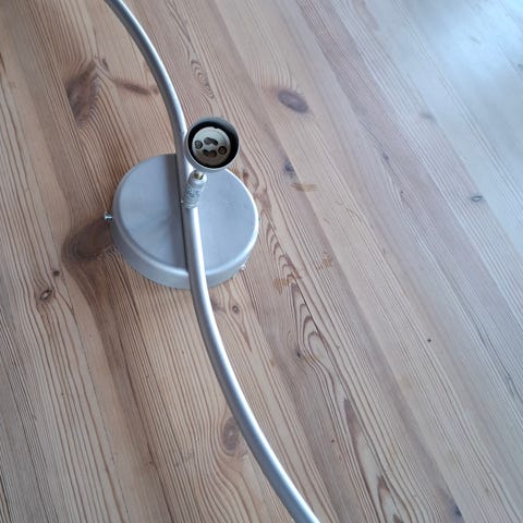 Helt utfälld längd 160cm, med 90° vinklar 120cm lång. Ledbar på valfritt sätt. Helt hopfälld, (se bild) 53cm. Lamporna 15cm från tak o rören 8cm från tak. Blankt stål.