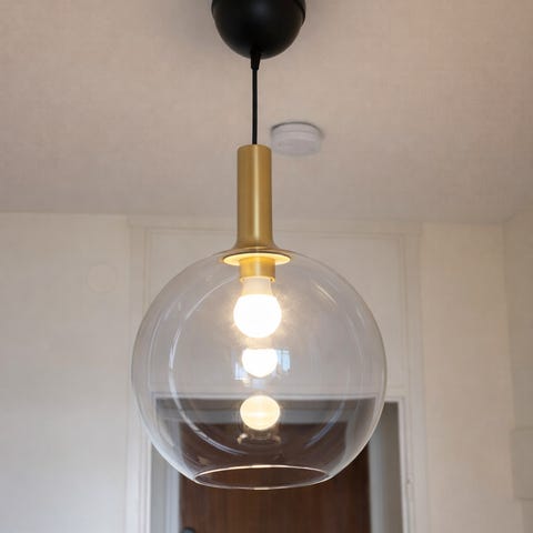 Mio taklampa formgiven av Alberto Meda. Taklampan har fem armar med konformade glasskärmar i gul/beige ton och detaljer i mörk metall. Lampan är avsedd för montering i tak och ger riktat ljus nedåt från varje skärm. Passar exempelvis i vardagsrum, matsal eller hall. Materialkombinationen metall och glas ger en robust konstruktion med dekorativa mönster på skärmarna.