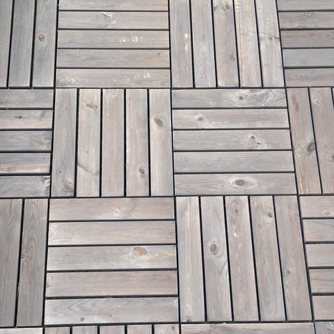 Jysk Knekkand trallplatta 30x30 cm i brun trä med plastundersida och klicksystem. Plattorna är avsedda för användning som golv på exempelvis balkong, altan eller uteplats. Måtten per platta är cirka 30 x 30 x 2,8 cm enligt förpackningen. Träet är monterat på ett rutnät av plast med fästen som gör att plattorna kan kopplas samman till en större yta. 22 oanvända bitar och lite rester.