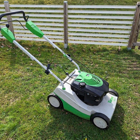 Viking MB 448 gräsklippare med bensinmotor. Modellen är utrustad med uppsamlare baktill och har fyra hjul. Klipparen är grön med vit uppsamlare och handtag. Passar för klippning av gräsmattor i villaträdgårdar och liknande ytor. Finns ingen gnista så maskinen startar ej, drivningen var fungerande när maskinen startade,
