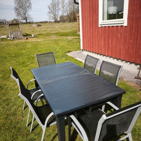 Alltid stått skyddat för väder och vind. Finns även 2 stycken soffor i samma material och färg som kan kombineras och då får åtta personer plats runt bordet. Sofforna säljes var för sig för 400:-/st