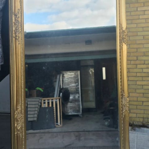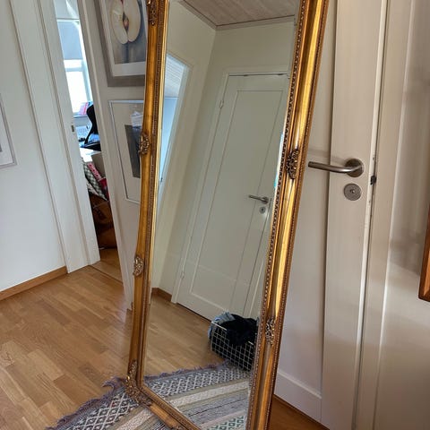 Spegel med guldfärgad ram. Rektangulär helkroppsmodell som kan användas stående mot vägg eller upphängd. Passar i exempelvis hall, sovrum eller vardagsrum för helkroppsspegling och rumsförstoring.
