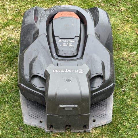 Husqvarna Automower robotgräsklippare i silverfärg. Modellen är en automatiserad gräsklippare som klipper gräsmattan inom ett avgränsat område med hjälp av begränsningskabel.