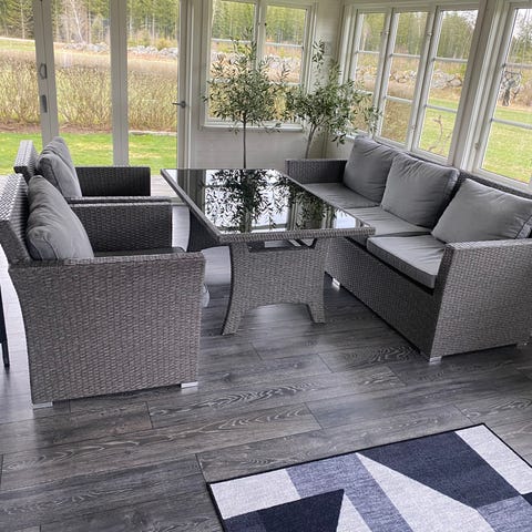 Matgrupp konstrotting med dynor, bord, 6 stolar
